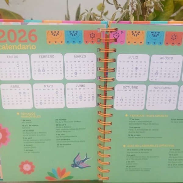 Tapa dura . Interior totalmente a color. Incluye Datos personales, horarios semanales, 3 días por hoja, calendario 2026, calendario 2027, calendario litúrgico, notas.