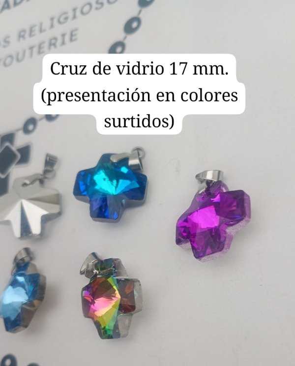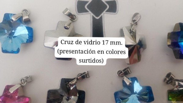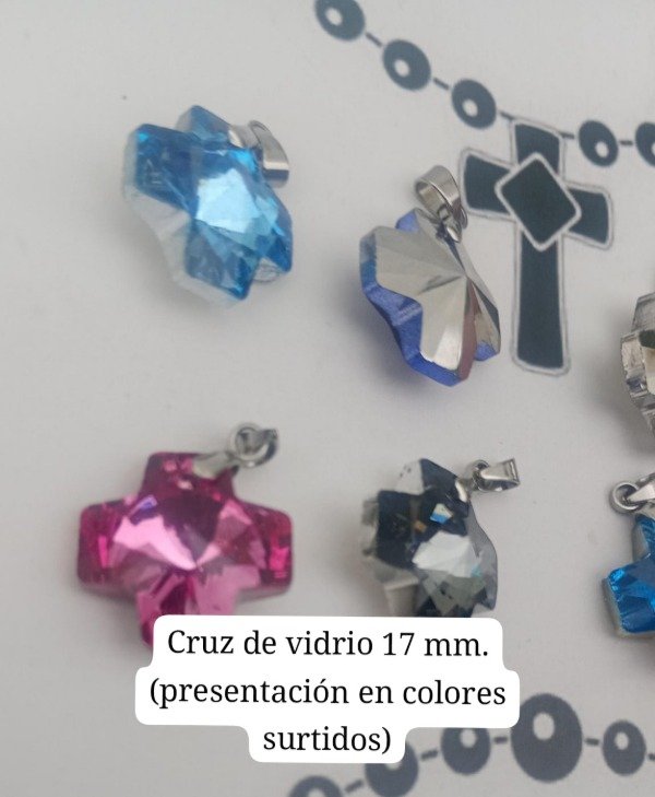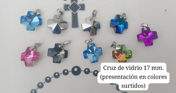 Cruz vidrio con acero quirúrgico de 1,5 cm, tornasolada de una lado y plateada del otro. Presentación en colores surtidos que no son a elección.