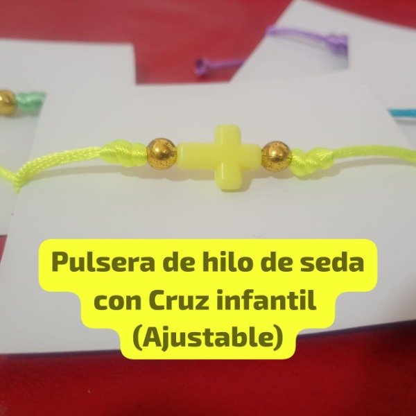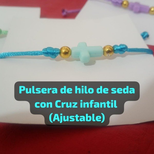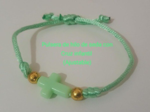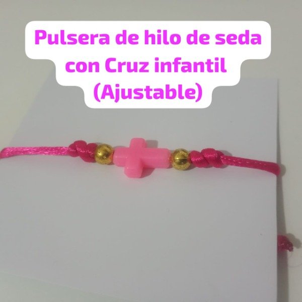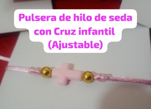 Pulsera fabricada con hilo de seda. Es ajustable, lo cual permite colocarla en la muñeca a la medida de cada persona. Presentación en estuche transparente.