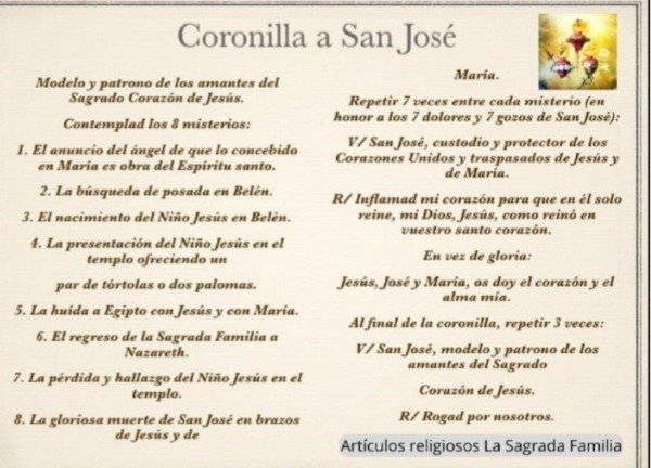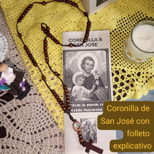 Coronilla de S. José fabricada a mano, íntegramente con cuentas y cruz de madera. Incluye folleto explicativo blanco y negro.